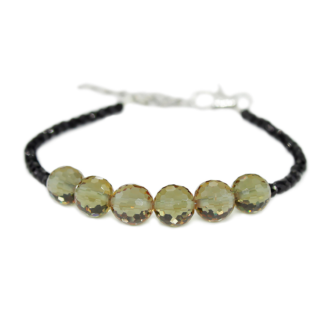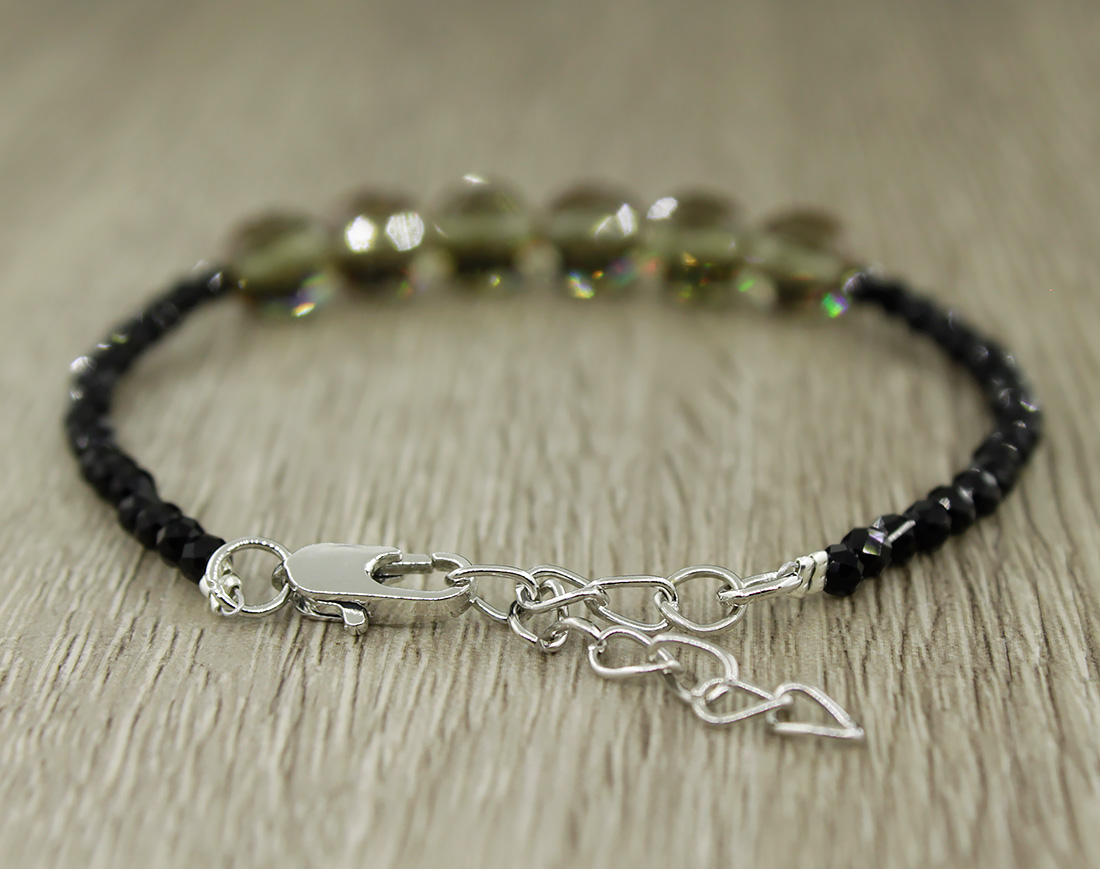 Браслет выполнен из удивительного камня султанит. Переливы каждой грани бусины в сочетании с мелкими бусинками шпинели, придают украшению изумительное сияние. В то же время форма бусин - строгая, классическая. Диаметр бусин султанита 8мм, шпинели 3мм. Длина браслета 17,5...21см, регулируется удлиняющей цепочкой.