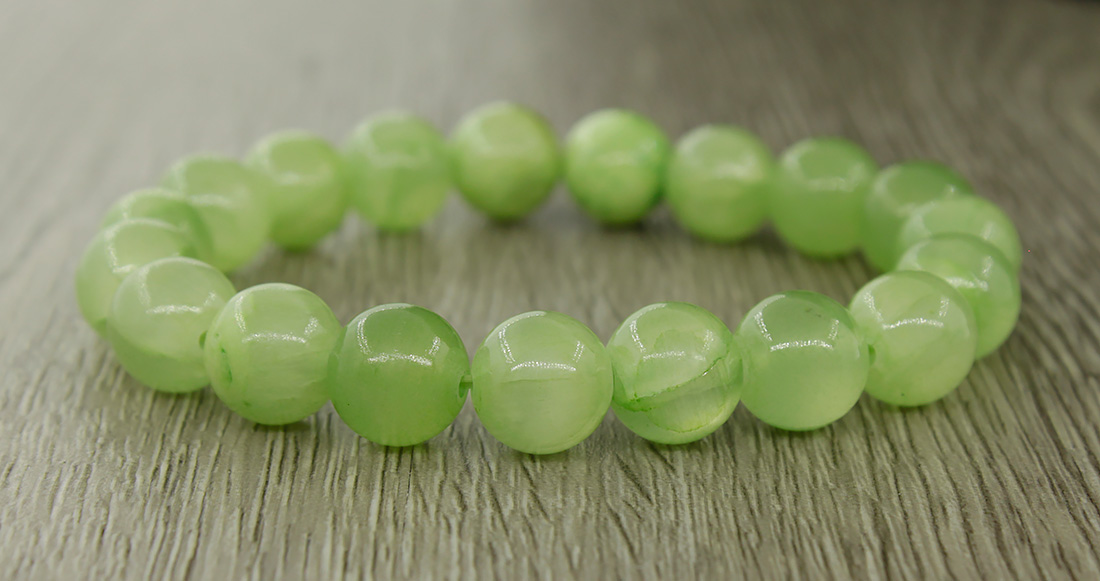 Классический браслет из светлого оникса, выполнен на резинке. Диаметр бусин 10мм. Длина украшения 17см.