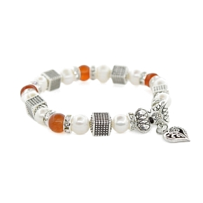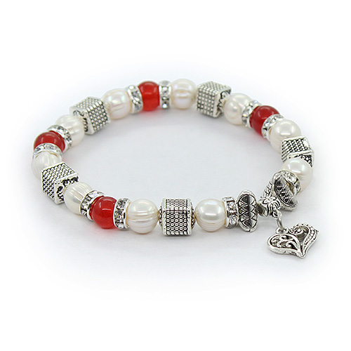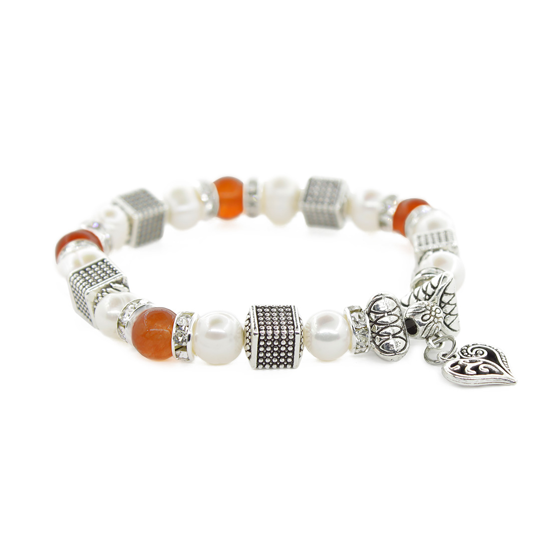 Браслет собран из натурального речного жемчуга и разбавлен необычными вставками и подвеской "сердечко". Примерная длина браслета 17см.
